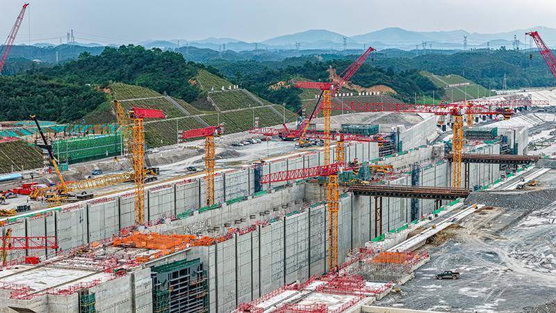 “青年枢纽船闸是国内在建最大的互灌互泄型式省水船闸。闸室内供船舶停泊的水域长度达300米,宽度34米。运行时上下游最大水位落差10.32米,可通航载货量超过5000吨的大型船舶。”平陆运河集团广西平陆运河建设有限公司工程管理部部长王显张介绍,为了减少用水量,青年枢纽双线船闸可互相输水运行,即一线船闸可作为另一线船闸的省水池,两线船闸互相输水时能节省船闸用水量约50%,从而有效节约水资源、土地资源和工程造价。